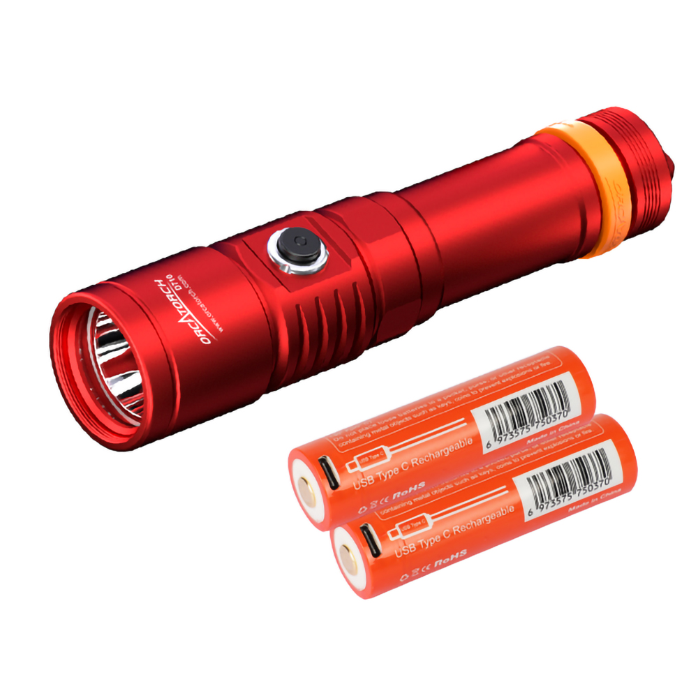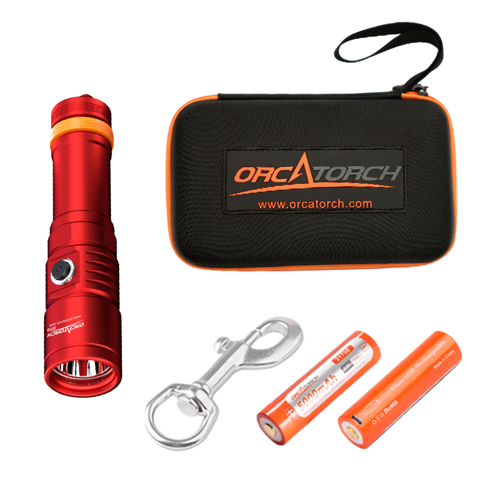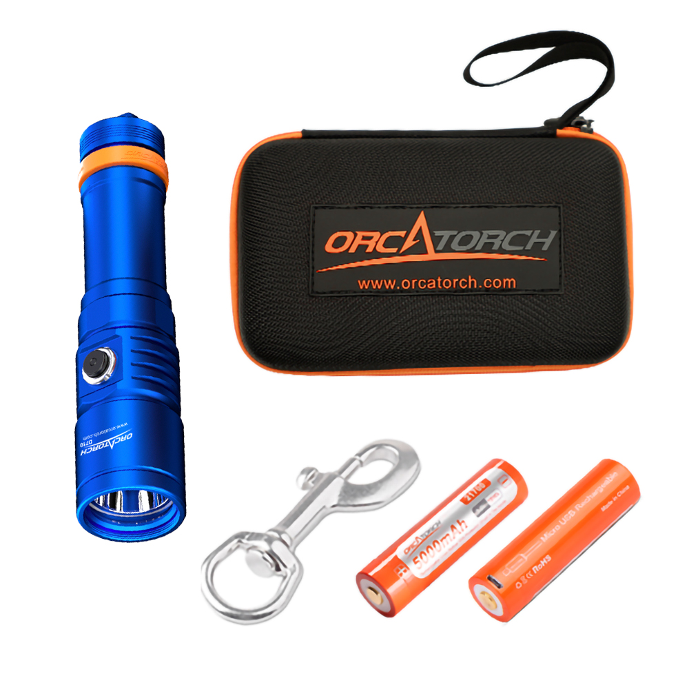 OrcaTorch D710 With A FREE Spare Battery. The Orca D710 is a high powered dive torch with an aluminium body and push button switch, the D710 is suitable for all divers and is an incredibly powerful yet compact dive torch. This gift set includes an additional USB chargeable battery and a stainless steel bolt snap.