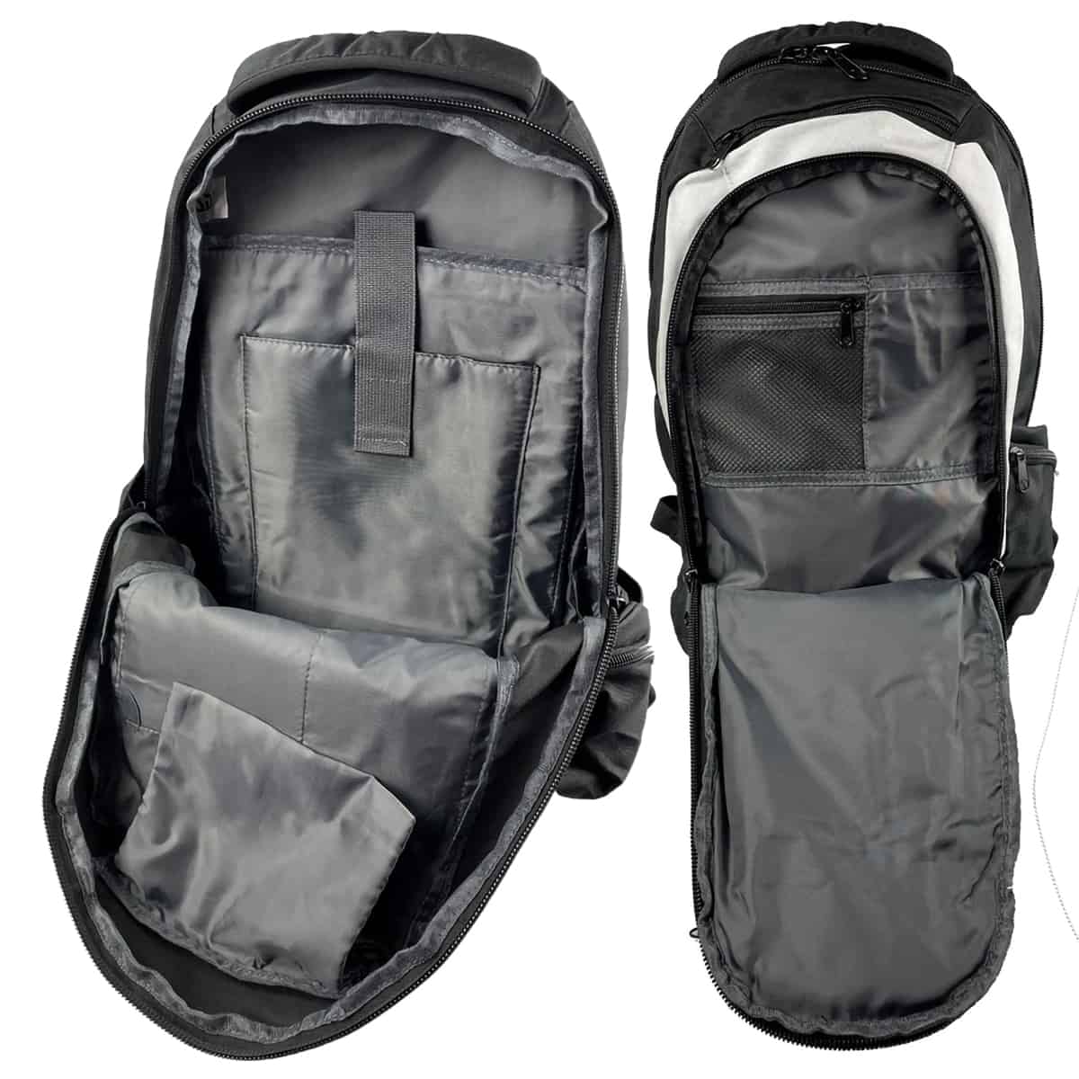 The backpack has a large main compartment with internal storage sections. This main section has 2 padded sleeves that are ideal for storing a laptop safely and a mini Ipad. The second zipped compartment has various smaller storage pockets and is big enough for guide books etc. There is a small zipped pocket on the top ideal for sunglasses or dive computer.